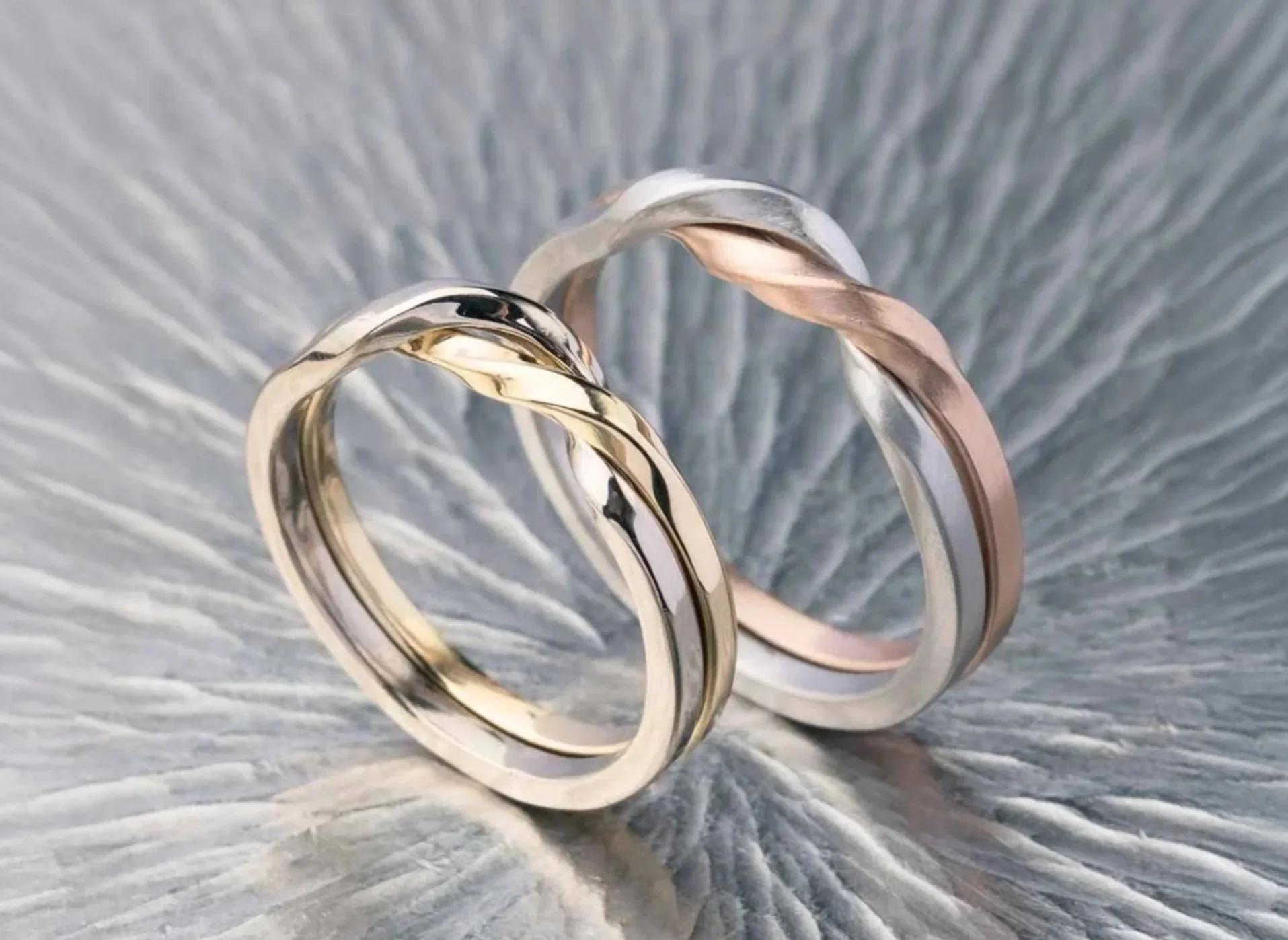 The two rings can be in different thickness, texture, twisting and finishing.